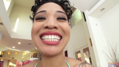 Honey Gold verschluckt sich an einem weißen Schwanz und sie nimmt ihn tief in ihren Hals. Sie kriegt eine große Ladung in ihr Gesicht.