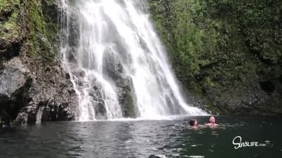 Ein Paar findet eine malerische Stelle in der Nähe eines Wasserfalls, um geil zu werden. Sie gibt ihrem Mann neben dem Fluss einen heißen Blowjob.